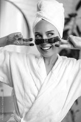Woman applying black facial mask while smiling in a bathroom wearing a white robe and towel