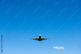 Airplane in the clear blue sky, preparing to landing, front view from the ground