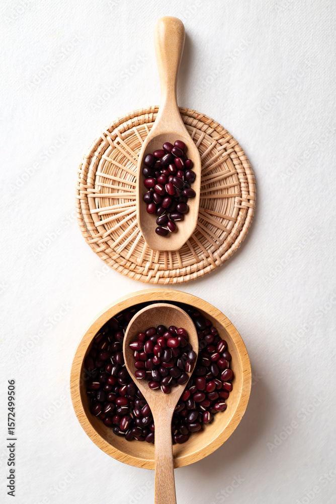 Top view of raw Azuki beans or red mung beans in wooden bowl and spoon on white background, Food ingredient