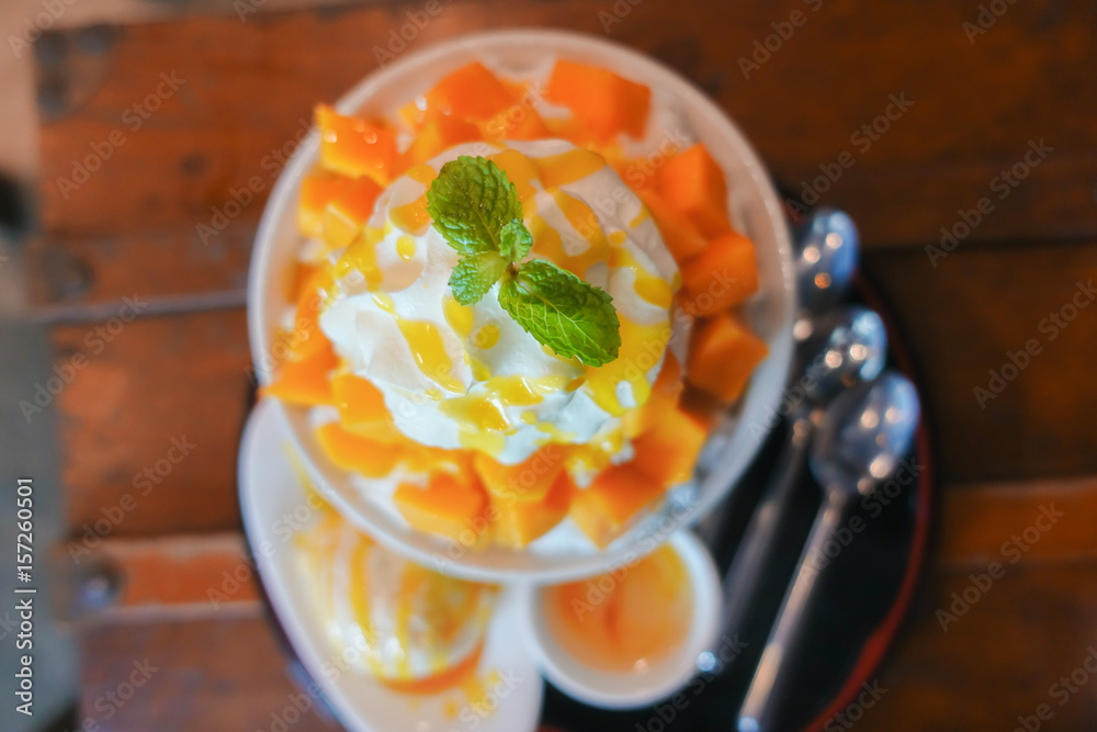 Soft focus Snow ice Bingsu mango with sweetened condensed milk, Korea dessert style