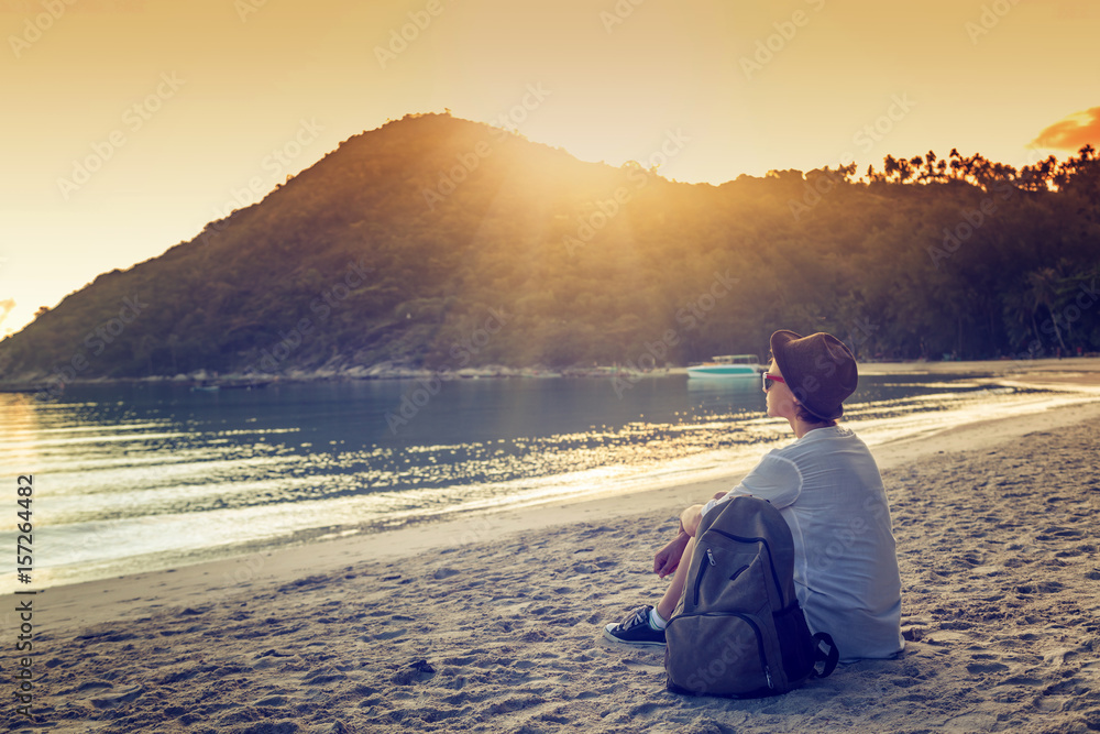 Young woman traveler sits on the beach in the sun. She admires the sea and the sunset.