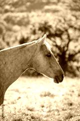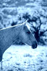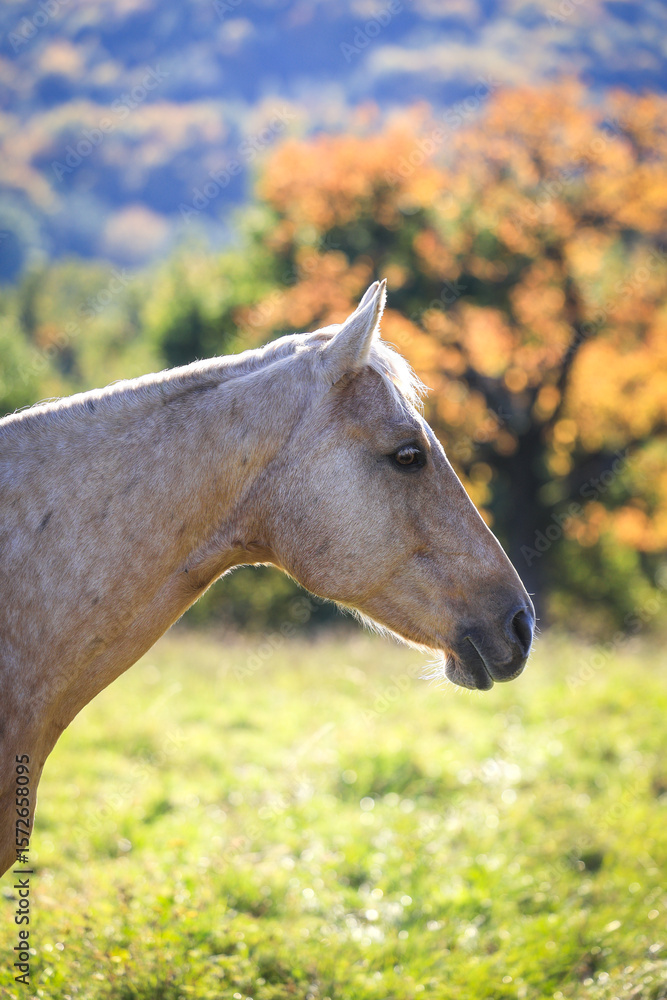 Palomino horse on pasture at sunny day. Portrait of animal in autumn countryside