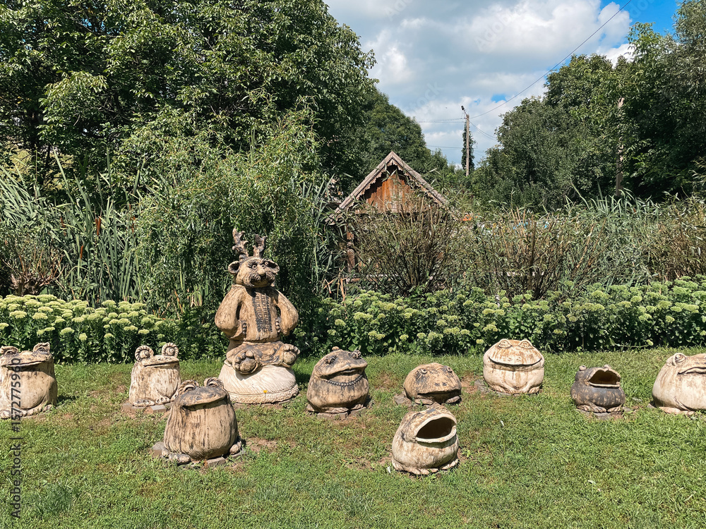 Unique pagan sculptures depicting frogs and mystical figures in Opishnia, Poltava, Ukraine, highlighting local culture and beliefs