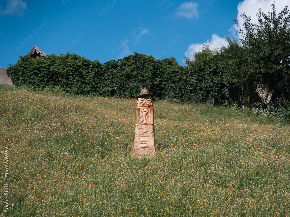 Exploring pagan culture in Opishnia, Poltava region of Ukraine with stone sculptures in a lush landscape