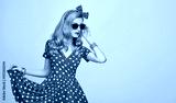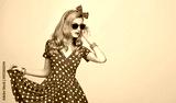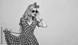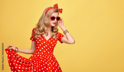 Fashion Model Girl in Polka Dots Summer Dress. Stylish Curly hairstyle, Trendy Clutch, fashion Red Headband, Sunglasses. Beauty Blond Pinup Woman in fashion pose. Glamour Playful Sexy Lady on Yellow