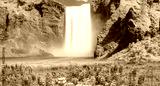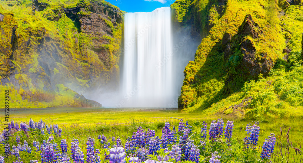 Icelandic Landscape concept - View of famous Skogafoss waterfall and amazing rainbow
