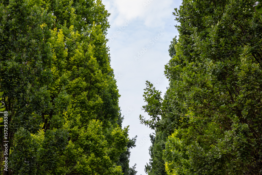 Majestic tall green tree canopy frames an expansive bright sky, creating a natural archway and symbolizing robust environmental health, natural growth, and peaceful outdoor serenity