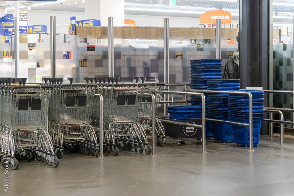 Neatly lined empty metal shopping carts and blue plastic baskets are ready for customer use within a modern, bright supermarket retail environment