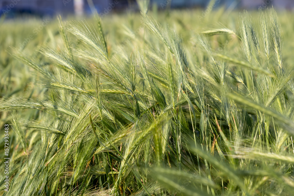 Lush green spikes of young grain plants populate a vast agricultural field, symbolizing healthy natural growth and sustainable farming practices