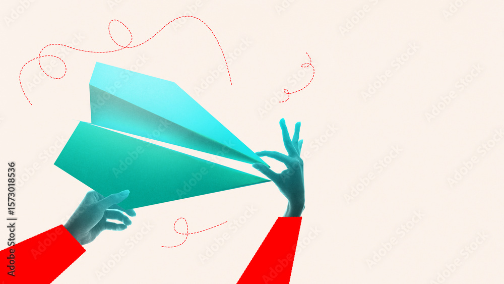 Digital collage. Two stylized hands with red sleeves launch a large turquoise paper plane with a dotted path. Concept of challenge navigation, fast-paced business environment