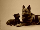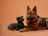 A German Shepherd and a black puppy sit side by side on a peach background, creating a heartwarming image. The contrast in their sizes and fur textures adds depth to the composition.