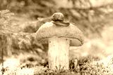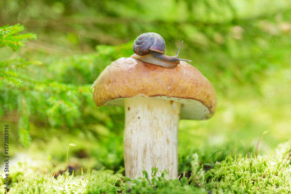 Snail crawling on the edible mushroom in a forest on green background. Boletus edulis mushrooms