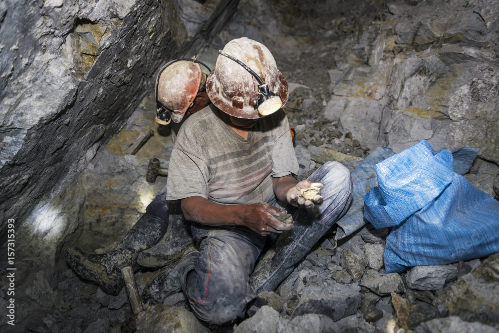 Potosi, Bolivia - November 29, 2013: Two miners looking for silver in the silver mine of the Cerro Rico in Potosi, Bolivia.