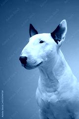 A white Bull Terrier with black-tipped ears looks sideways against a seamless blue background. The clean lighting and studio setting emphasize its elegant and serene demeanor.