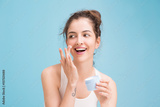 Woman with cream on blue background