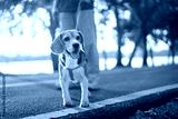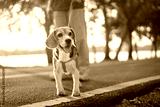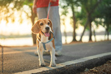 Owner and his beagle dog is having fun while walking in dog park in morning summer, Dog training, copy space.