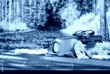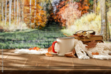 Still life composition on rustic wooden table, set against the backdrop of an autumn forest. Fallen leaves, earthy colors, natural textures, cozy seasonal sustainability and nature-inspired lifestyles