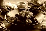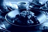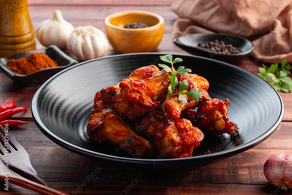 Air Fryer spicy marinated chicken drumettes in black plate.Healthy cooking low calorie.