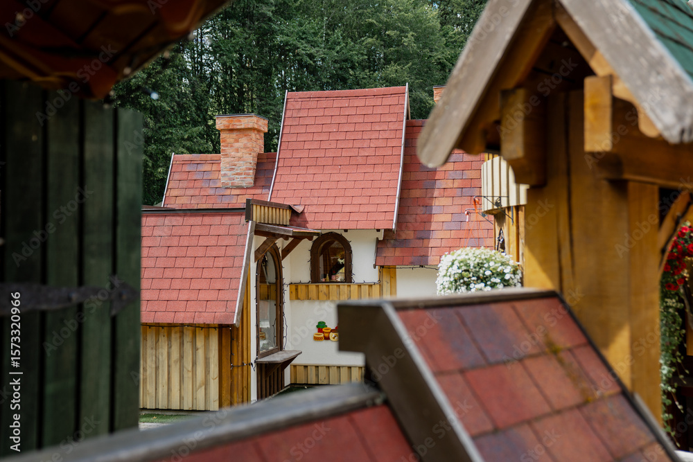 Colorful wooden houses with red tiled roofs in traditional village setting surrounded by green trees and garden flowers perfect for architecture nature in Tervete nature park
