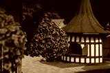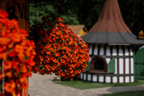 Beautiful hanging red flowers in sunny park with traditional round building in background perfect for garden architecture travel and nature stock photography and decoration themes