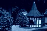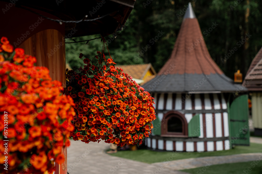 Bright orange hanging flowers and traditional wooden house with tower roof in sunny park setting ideal for gardening, outdoor decor, stock photography and architecture inspiration concepts