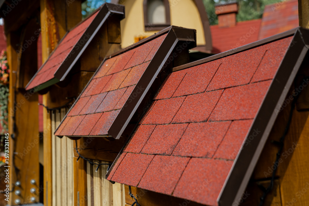Close up of red tiled wooden roofs on small decorative houses in sunny park with traditional architecture perfect for stock photography and outdoor garden design and building construction concepts