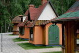 Charming small wooden houses with colorful roofs and green doors in forest park setting ideal for architecture, construction, roofing, landscaping, and exterior design inspiration