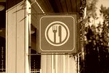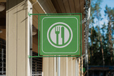 Green restaurant sign with fork and knife symbol hanging outside wooden building in forest park area showing dining place available for visitors and tourists in natural environment