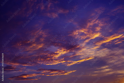Purple golden sunset. Evening sky with clouds background. Dark blue violet pink golden orange yellow.