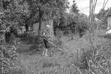 Elderly man trimming grass in vegetable garden. Senior man uses a red string trimmer to cut tall grass along the edge of a lush vegetable garden surrounded by trees.