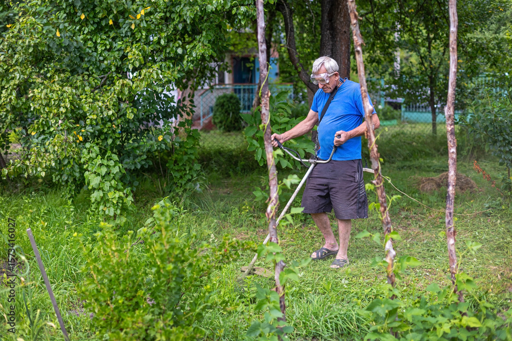 Older man trimming backyard grass near garden plants. Senior man uses a string trimmer to cut overgrown grass in a green backyard surrounded by bushes, trees, and garden supports.