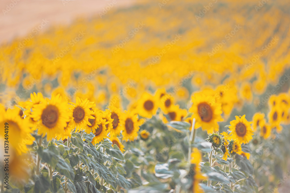 Vibrant sunflowers stretch across a golden landscape under a clear sky in late summer