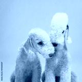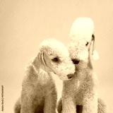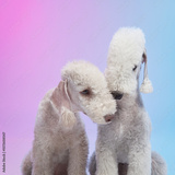 Two Bedlington Terriers gently nuzzle each other, displaying affection against a pastel background. Their soft expressions highlight their close companionship.