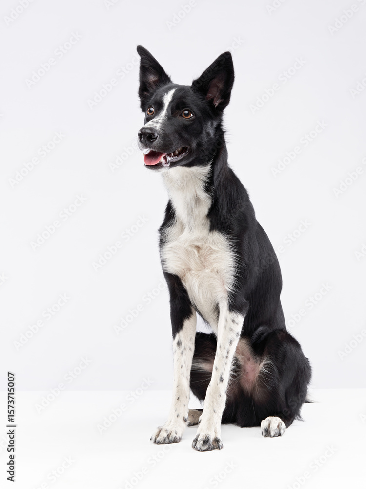 A black and white Border Collie stands confidently in a studio, gazing forward with an attentive expression. Its sleek fur and well-groomed appearance highlight its athletic and intelligent demeanor.
