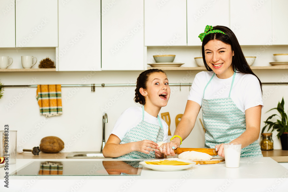 happy mother and daughter cooking dough, playing with flour, standing at white kitchen and laughing . Cooking together with kid