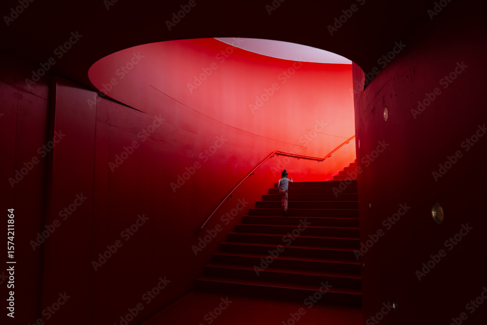 Person ascending dramatic red staircase into light, conceptual architectural interior with abstract shapes, emotional journey through vibrant minimalism and modern industrial design
