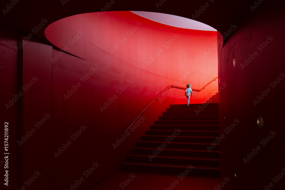 Child stepping into light on abstract red staircase, metaphor for innocence, hope, and transformation within symbolic minimalist architecture and emotional contemporary space