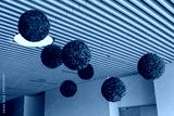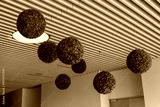 Modern interior with hanging green decorative spheres on ceiling, creative nature-inspired design element adding freshness and texture to contemporary architectural space