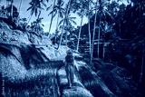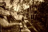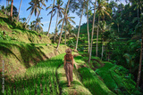 Young woman traveler wearing hat walking through picturesque green rice terraces in Ubud, Bali island, traveling to famous beautiful destinations