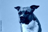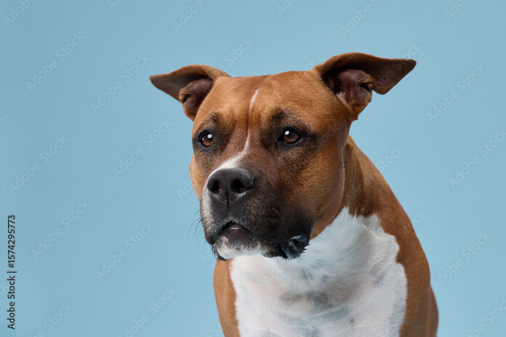 A staffordshire terrier dog glances left over its shoulder on a blue background. The angle shows curiosity and movement in its stance.