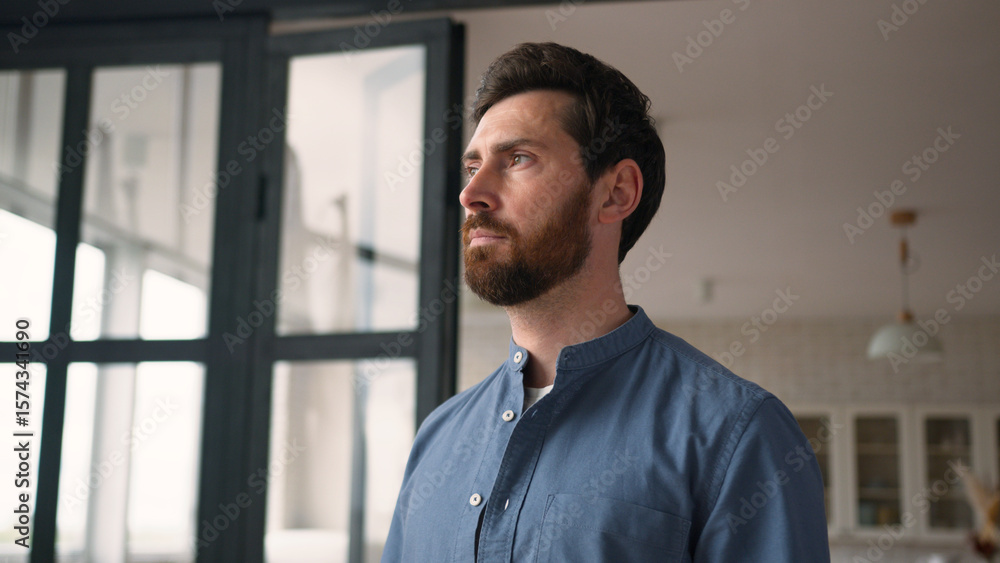 Thoughtful Caucasian man bearded guy middle-aged dad pondering at home. Pensive parent contemplating adult male father thinking with serious facial expression confident businessman feel calm dreaming
