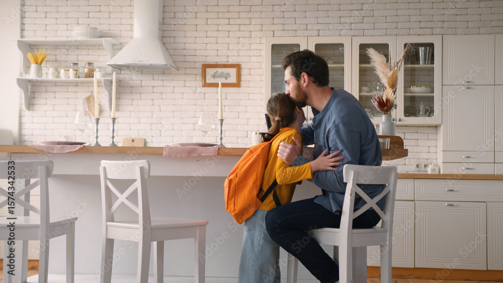 Carefree little Caucasian daughter girl kid run return home from school lessons carrying backpack education father guy man meeting child schoolgirl talk conversation male dad parent family cuddle kiss