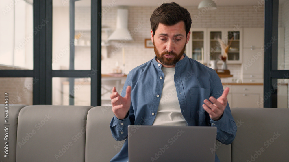 Caucasian dad male man talking online conference remote working video call discussion naughty child daughter smile little kid girl run touch interfere father distracting parent at home family trouble