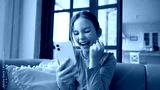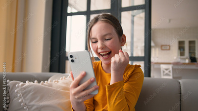 Cheerful little Caucasian kid child girl holding phone device smiling daughter winning rejoice. Happy schoolgirl celebrating victory in mobile game online app scream excellent result good news at home