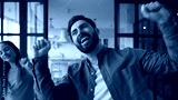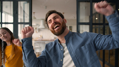 Carefree positive Caucasian family daughter kid girl smile child dancing with father dad man celebrating party laughing at home happiness music male daddy enjoy fun weekend little schoolgirl jump sofa