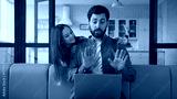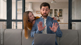 Busy Caucasian man male dad guy discussing business distant job laptop conference noisy kid girl distract father at home parent show hush gesture silence family happy little daughter child behave bad