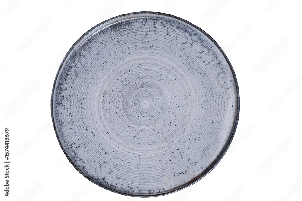 Trendy Circle Pale blue sand grain texture handmade Ceramic Dish plate, top view stoneware plate. Empty Blue ceramic plate on dark background. Empty spotted uneven saucer. Matte dish isolated white