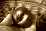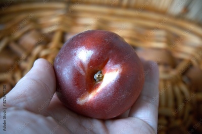 One whole nectarine in basket close up with hand.