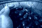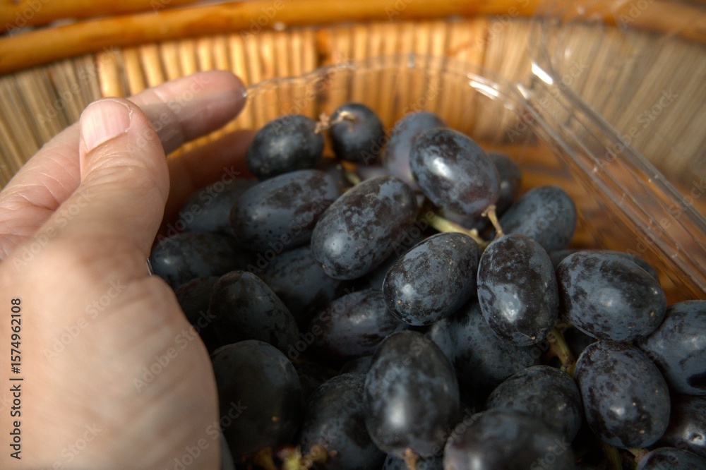Blue grape in transparent plastic box close up with hand.