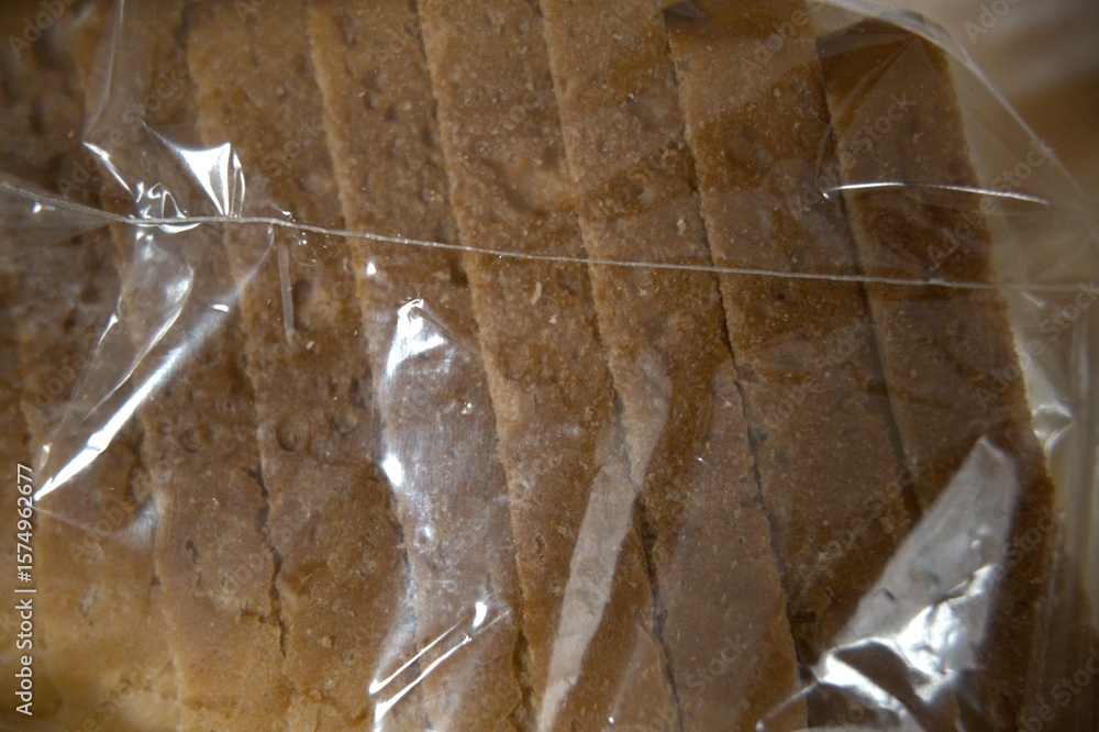 Sliced bread in transparent plastic bag close up.